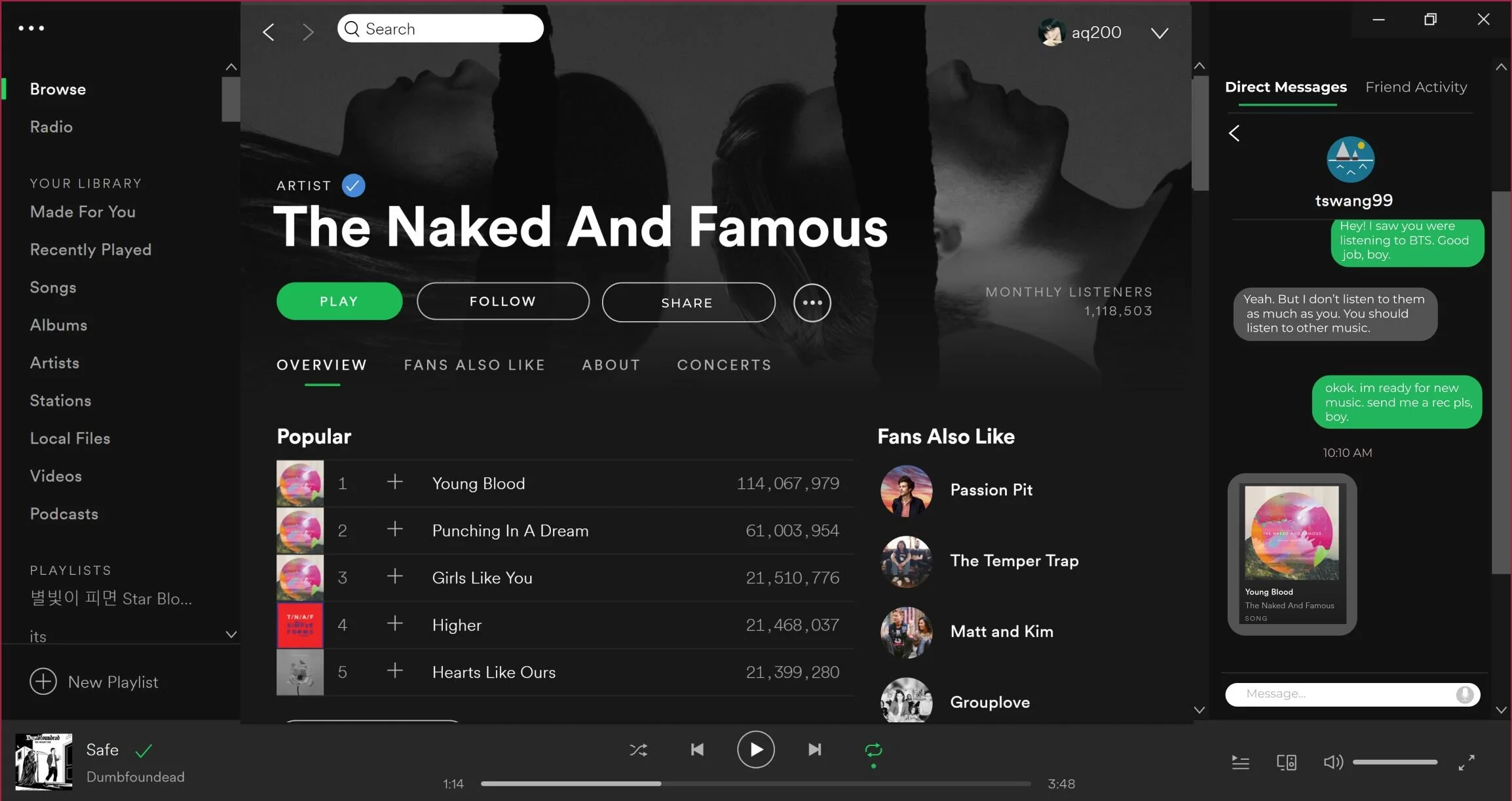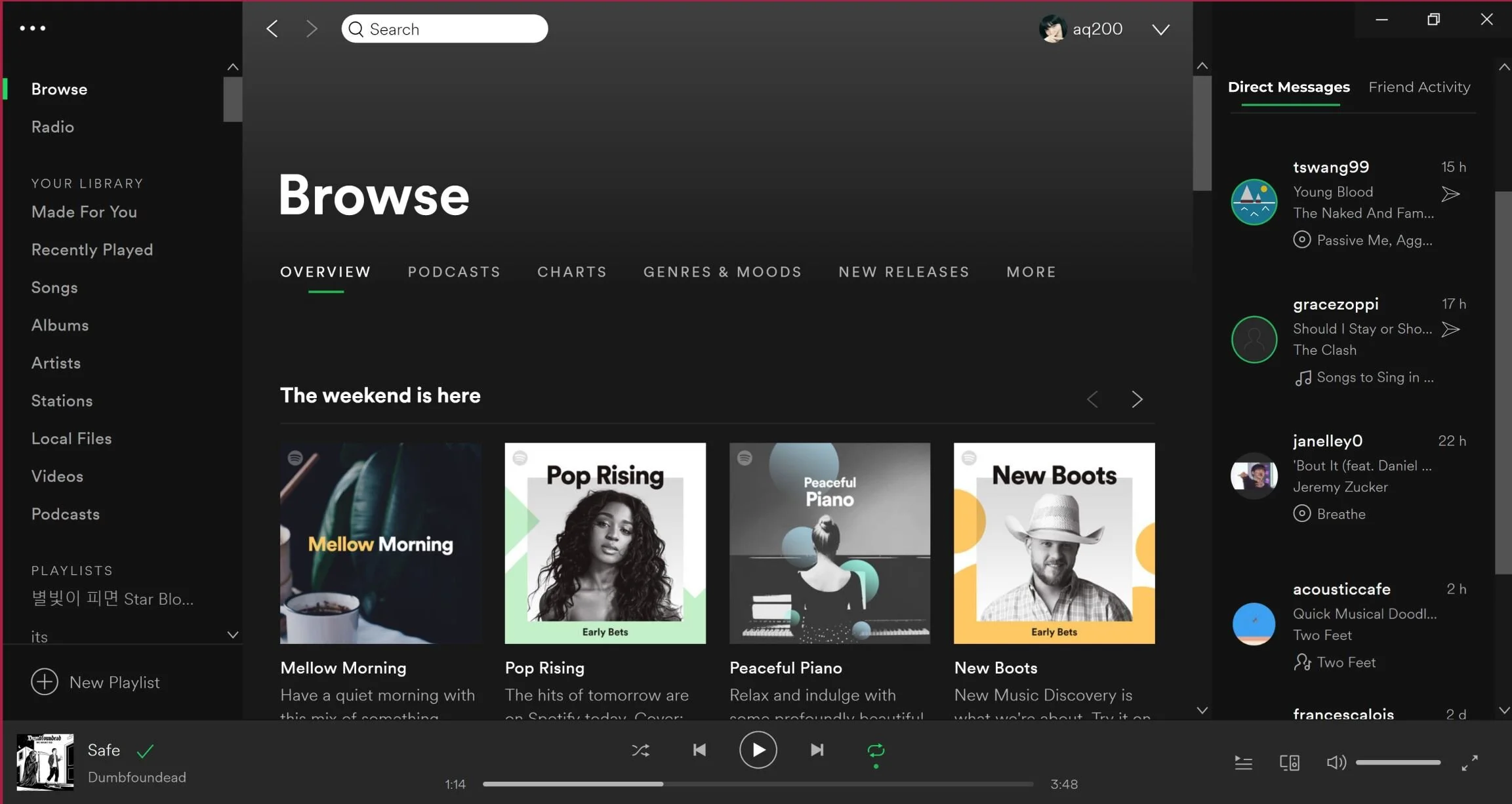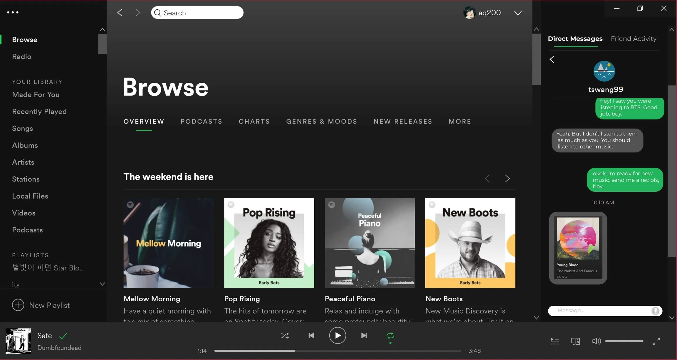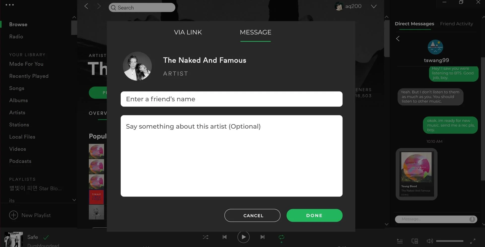 We built upon Spotify, a popular music streaming application, and improved their sharing features. Due to the limited time given to complete the project, we focused primarily on Spotify’s desktop application. One of the reasons we chose Spotify as it has a high demand in its forums for social features, specifically a direct message option.