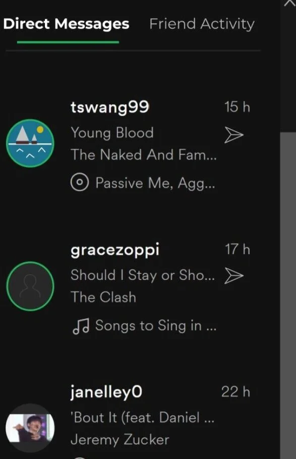 An unread message from “gracezoppi,” and no unread messages from “janelley0.” The last message was sent from whoever’s Spotify account this belongs to.